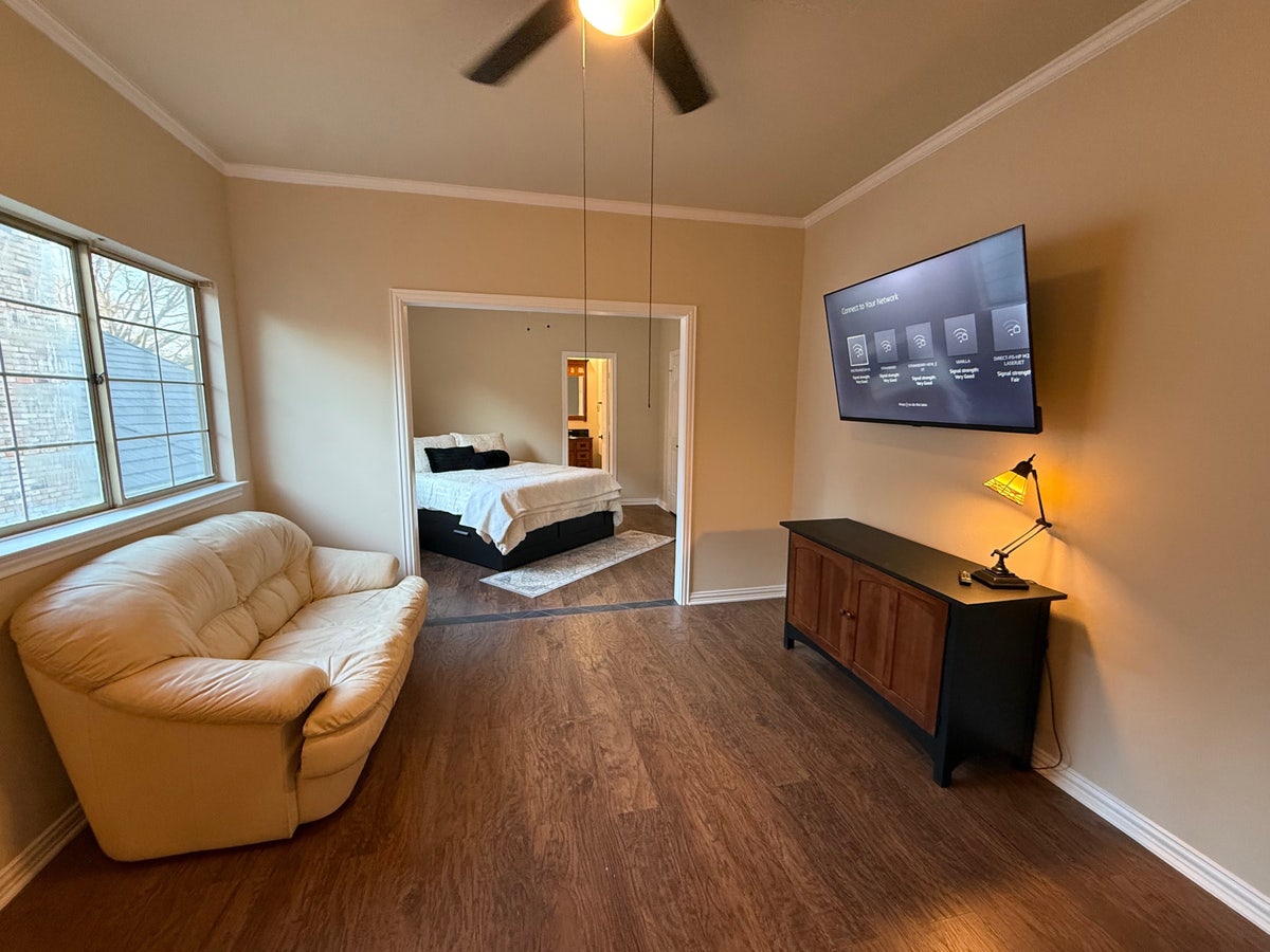 1 roomFurnished room with Queen bed, dresser, TV, full length mirror with with shared bathroom. Full internet, electric, water, 1x/month cleaning...