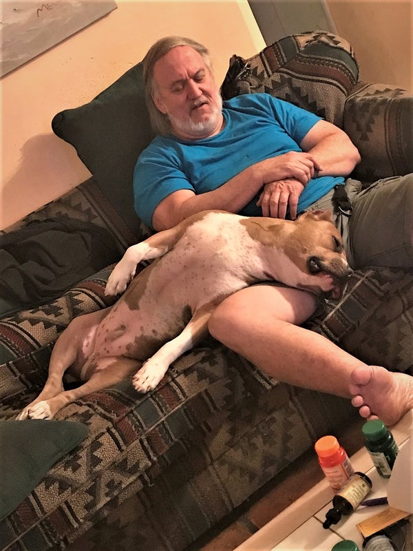 Picasso and I, my late mobility dog taking a nap together