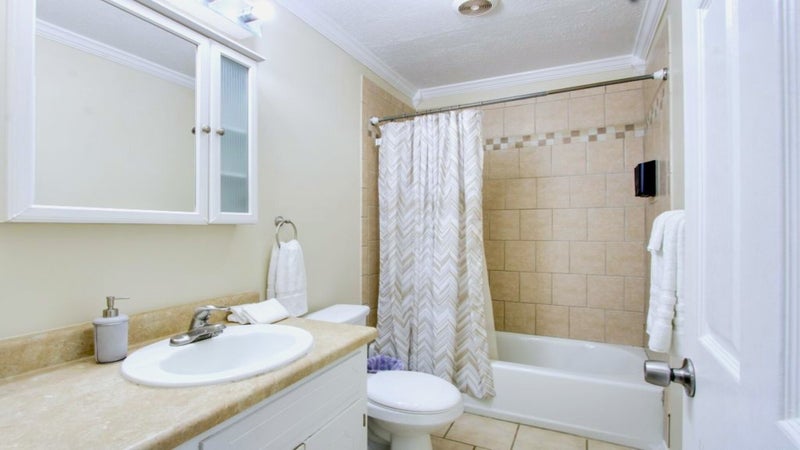 The home features three private bedrooms and two shared bathrooms, all located on a single floor. The first bedroom includes a queen bed, a standard closet, and a TV. The second bedroom also offers a queen bed, a regular closet, and a TV. The third bedroom features two full-size beds, a TV, and a regular closet. Bathrooms are shared and include one with a walk-in shower and tub with a single vanity, and another with a tub-shower combination and single vanity.