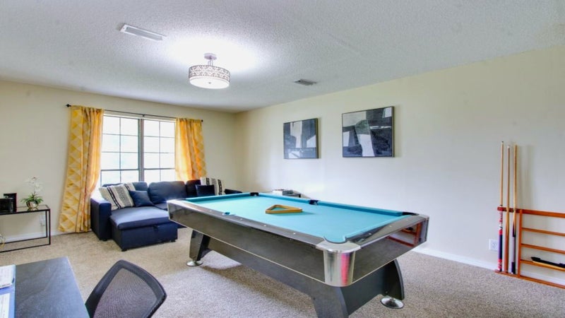 Shared indoor amenities include ceiling fans for added comfort, a cozy living area with two pull-out full-size couches and additional pull-out beds for flexibility, and a desk in the living roomideal for remote work. Flooring throughout the home is a mix of laminate and carpet for both durability and comfort. The open-concept kitchen is fully equipped with essentials such as a coffee maker and toaster, making meal preparation easy and convenient.