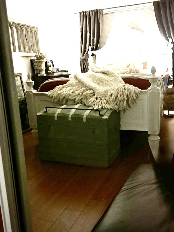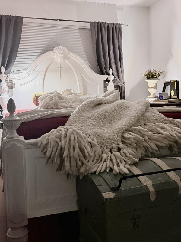 Room includes: Queen sleigh bed with Sealy Posturepedic mattress, Smart TV, dresser, nightstand, vintage hope chest, two large bookshelves, large mirrored closet with cedar hangers, linens, large screened window, and private keypad entry.
