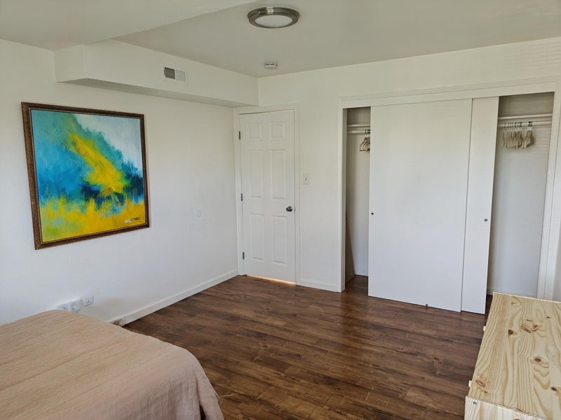 The room includes a bed, dresser, and nightstand. Shared kitchen, bathroom, and in-unit washer/dryer. Utilities are not included and are split evenly between tenants.
