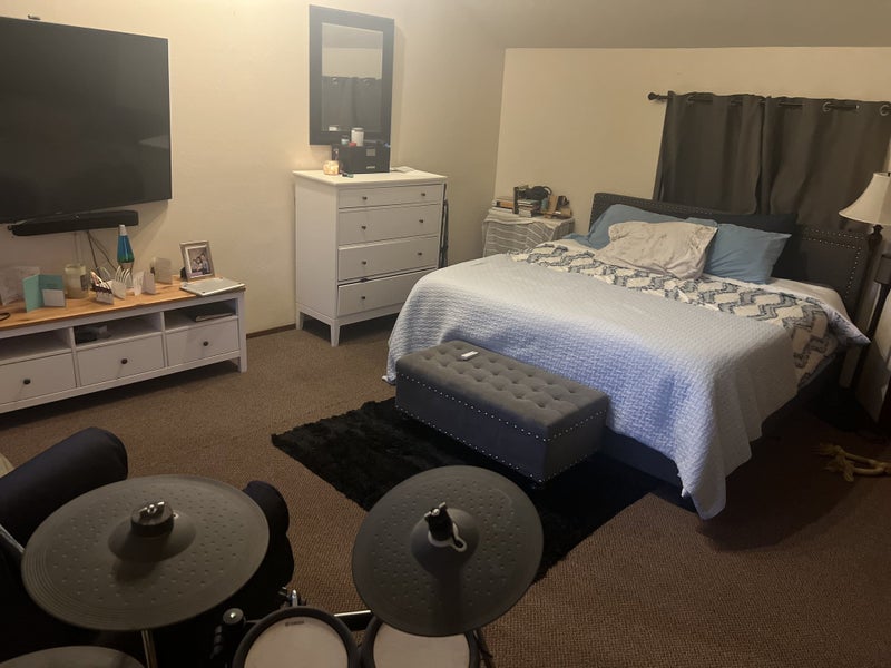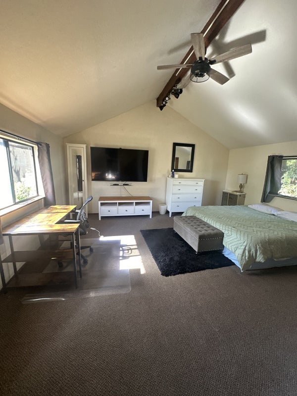 400 square feet with vaulted ceilings and a ceiling fan. Comes with a bed, large TV, desk, chair, and dresser. Natural light from multiple windows. Plenty of space to work and relax.