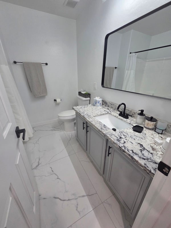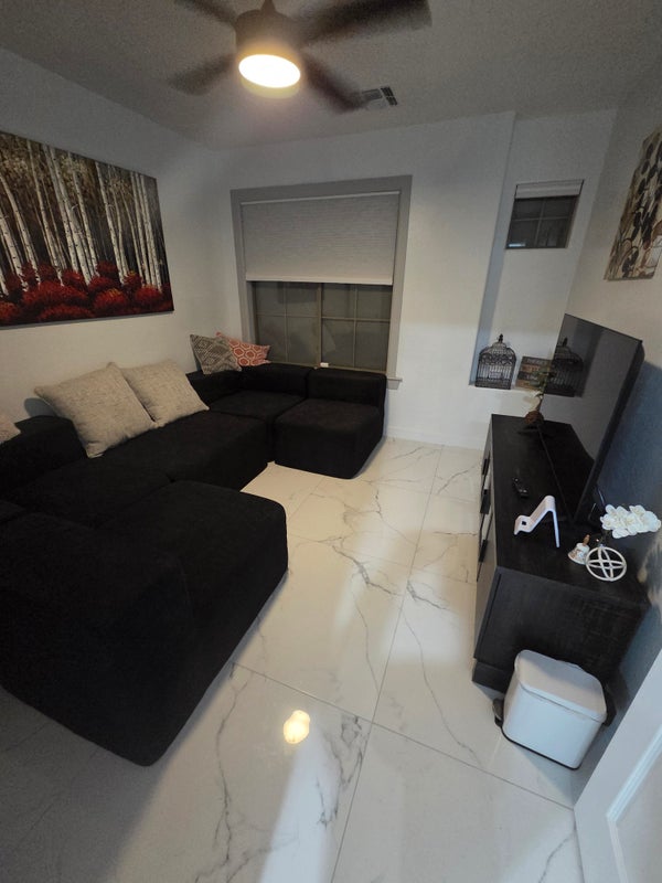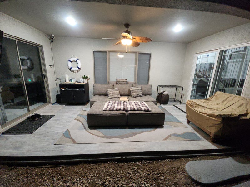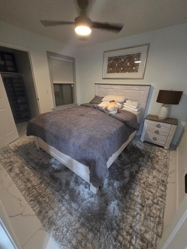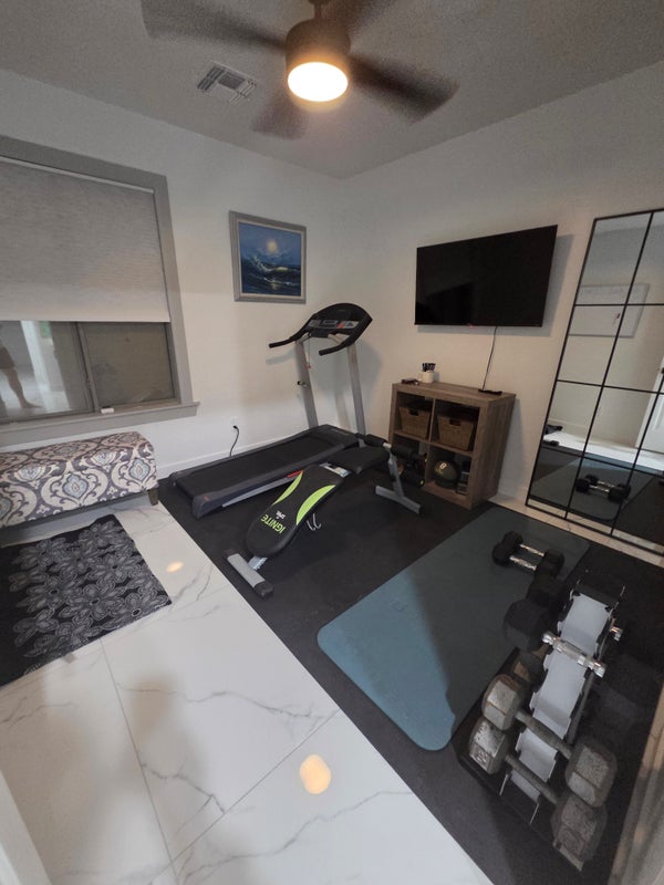 Corner bedroom with small walk in closet, adjacent to tv room, gym and private bathroom. Large house with plenty of room, large patio and pool outback. Just me and 2 dogs living here.