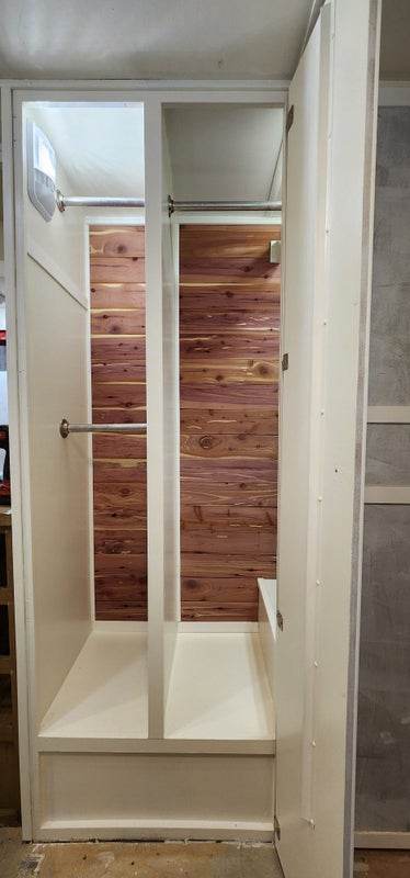 Rear bedroom remodel with new walk-around Platform Bed & Mattress, New reversible Vent Fan/Skylight, LG Washer / Dryer Combo, Natural wood trim and plank wall boards, Natural Cedar-lined closets, includes independently controlled A/C wall unit, and more...