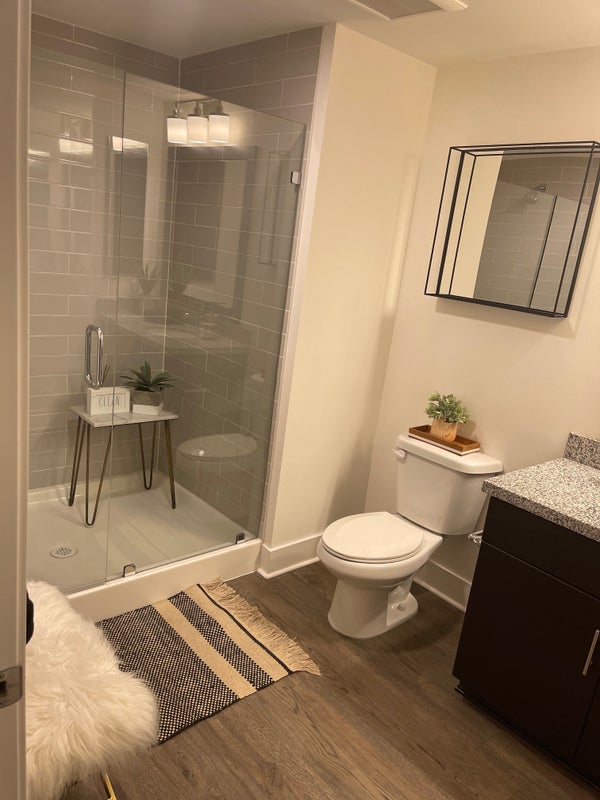The apartment features a spacious layout with a large walk-in closet, a beautiful glass walk-in shower, in-unit washer and dryer, and a dishwasher for convenient everyday living. There’s also a private patio large enough for a table and chairs, making it a great spot to relax or enjoy a meal outside.