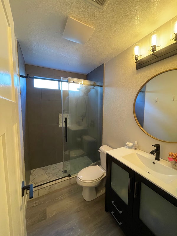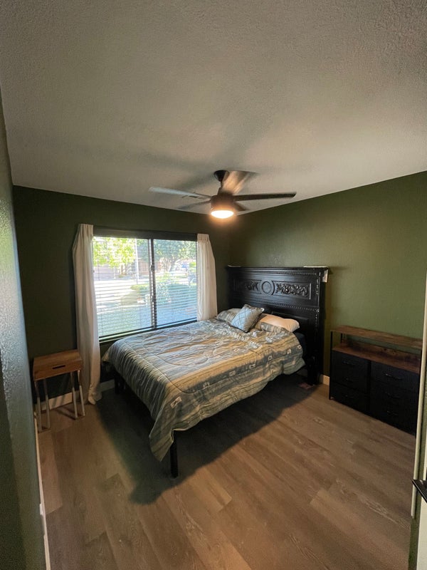 Room comes with driveway parking and the bathroom is shared with guests. There is a cat that lives in the house and she unfortunately doesn’t like 4 legged friends. Police/firefighter neighborhood.