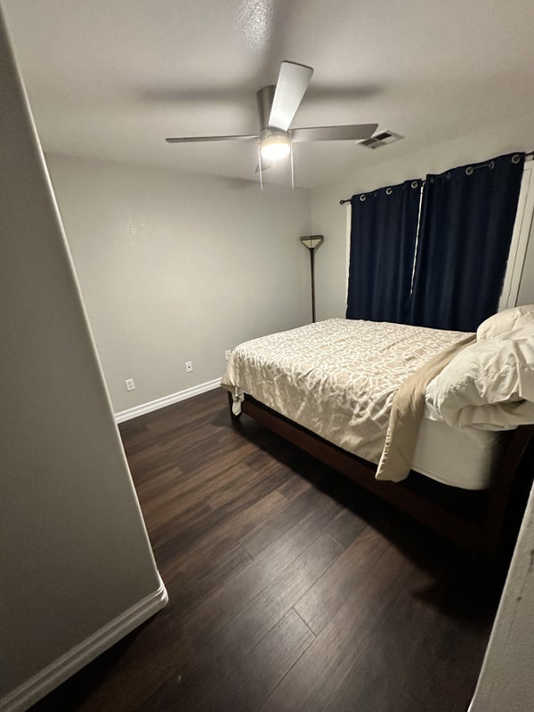 One room available for rent at $950/mo which includes all utilities. This is a two-story downtown Gilbert home with 4 bedroom 2.5 bath in which 1 full bath is shared with another male roommate. The home is 2000 sqft with an outside back yard wrap around patio and artificial turf for activities. Home is completely furnished including a queen size bed.