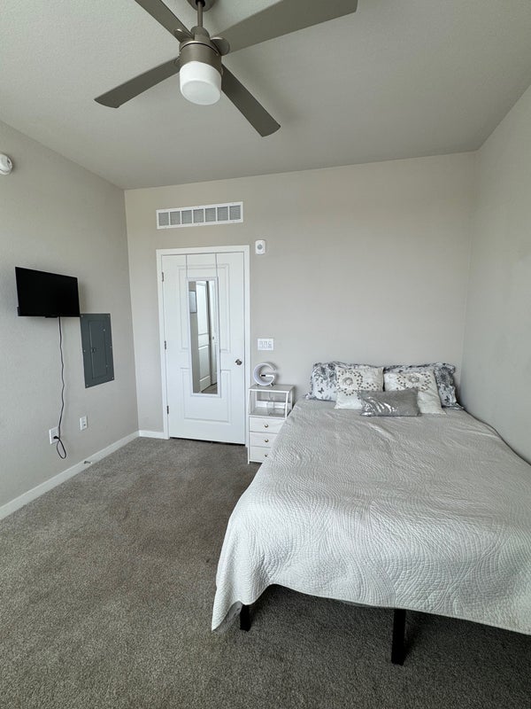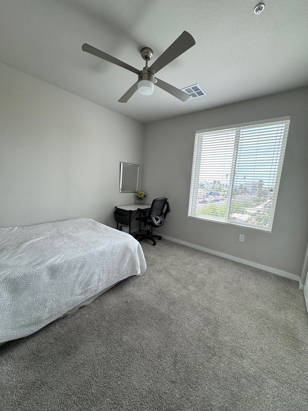 Private furnished room available in a luxury apartment in the heart of Downtown Mesa. The room includes a full-size bed, TV, desk, and full-length mirror, making it a comfortable setup for someone who wants a move-in-ready space.
