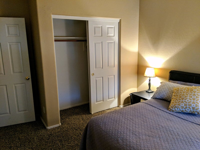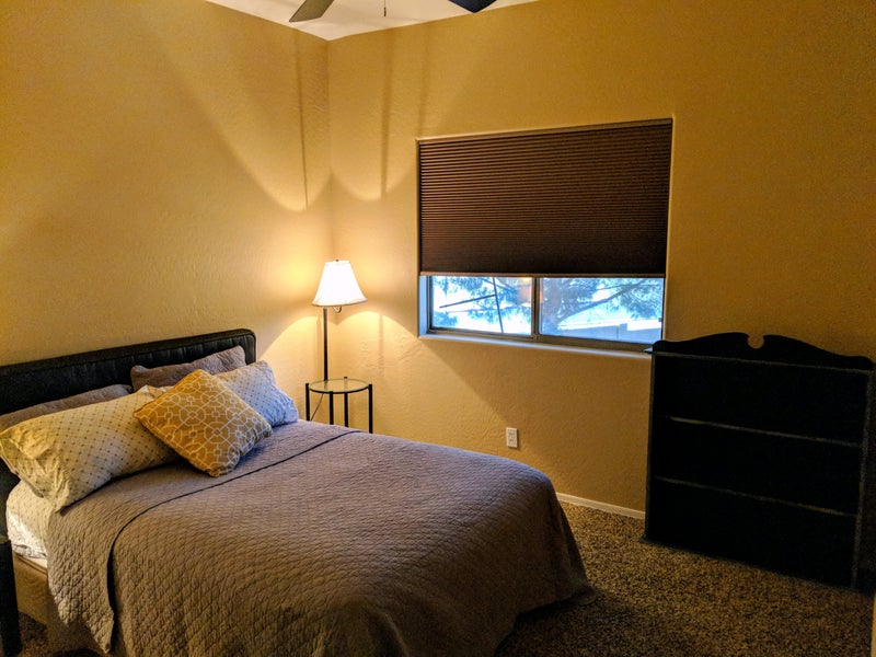 One small room with basic furnishings. Hallway full bathroom. Additional side office area for your use. If your vehicle is sedan sized, you have garage parking. Community pool.