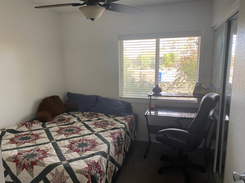 There are two rooms available, separated by closets, with a private bathroom across the hall. Please note that the rooms are just big enough for a queen bed and a small desk/chair. One room has a 55" TV which you are free to use. The rest of the house is shared, including a living room with couches, a La-Z-Boy, and a 75" TV.