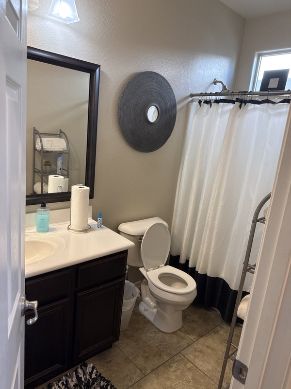 Downstairs room at front door. Full bathroom across from room. Spacious kitchen and outside seating area. Numerous hiking trails in walking distance. Grocery stores, shopping, and restaurants 3miles away.