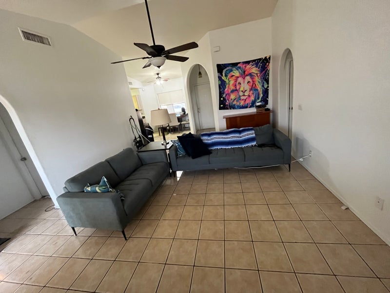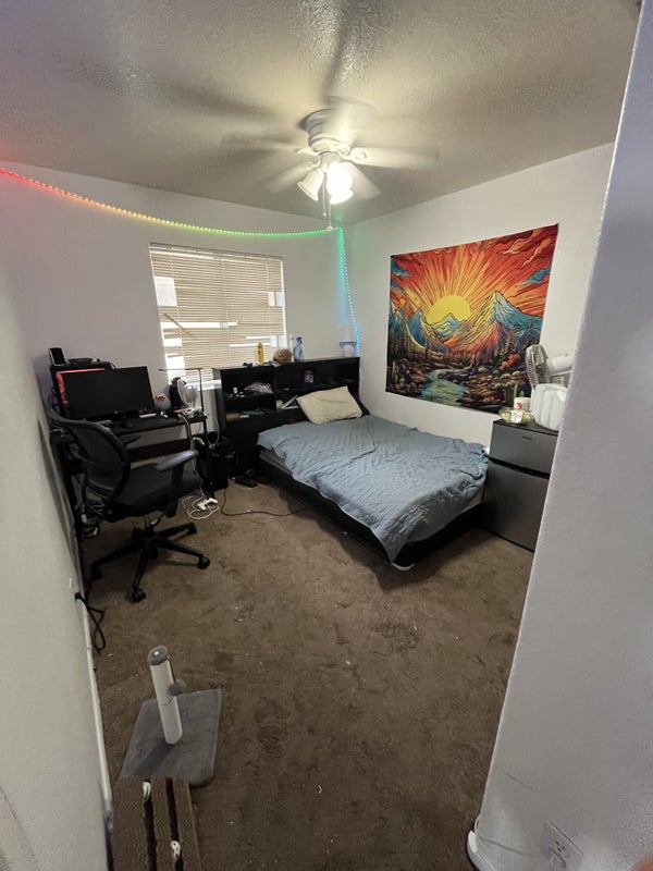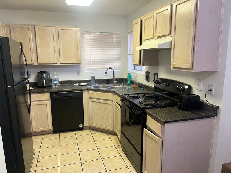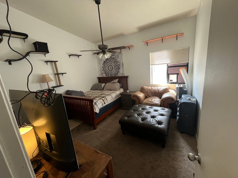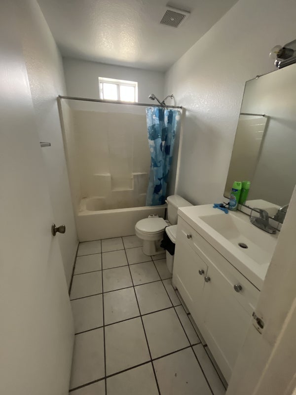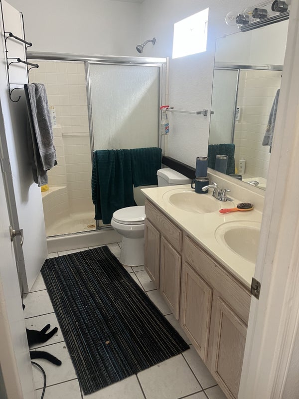 Two bedrooms share bath & A master bedroom private bath . Big garage available as well . I am ok with cat , but no dog .