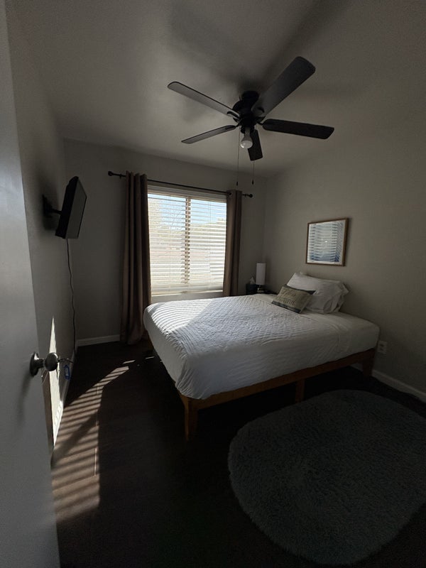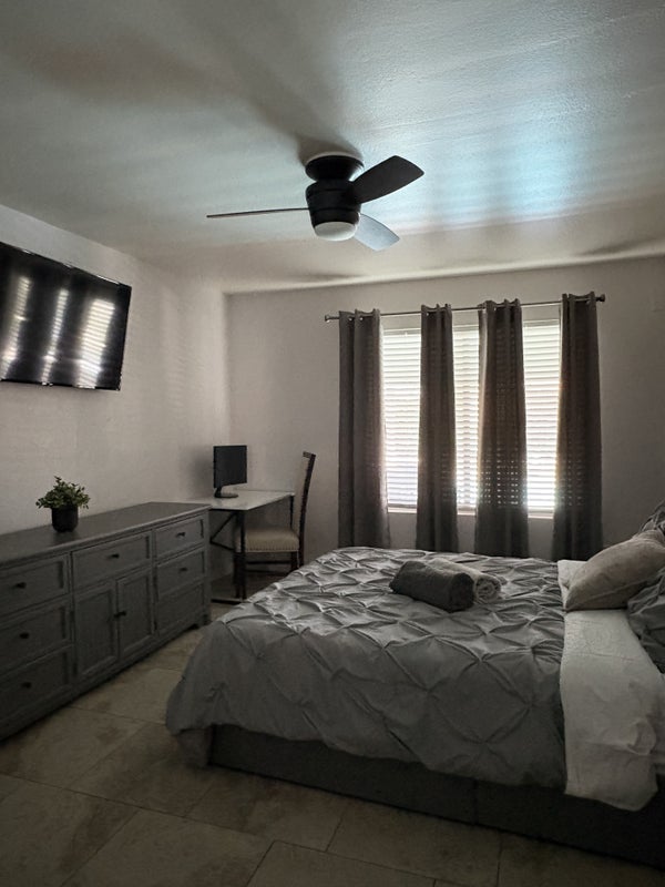 My home is about 1500 sf, ranch style in the heart of Chandler. There is plenty of street parking right in front of the house. There are 3 bedrooms plus my space across from the rest of the house, including a master bedroom/bathroom with a spacious closet, a rain shower, a 55" tv, a desk, a mini fridge, a microwave, and a very comfortable queen bed. The smaller room has a 32" tv, a mini fridge, small desk, and a spacious closet. Access to the kitchen, patio, pool, and laundry room is available.