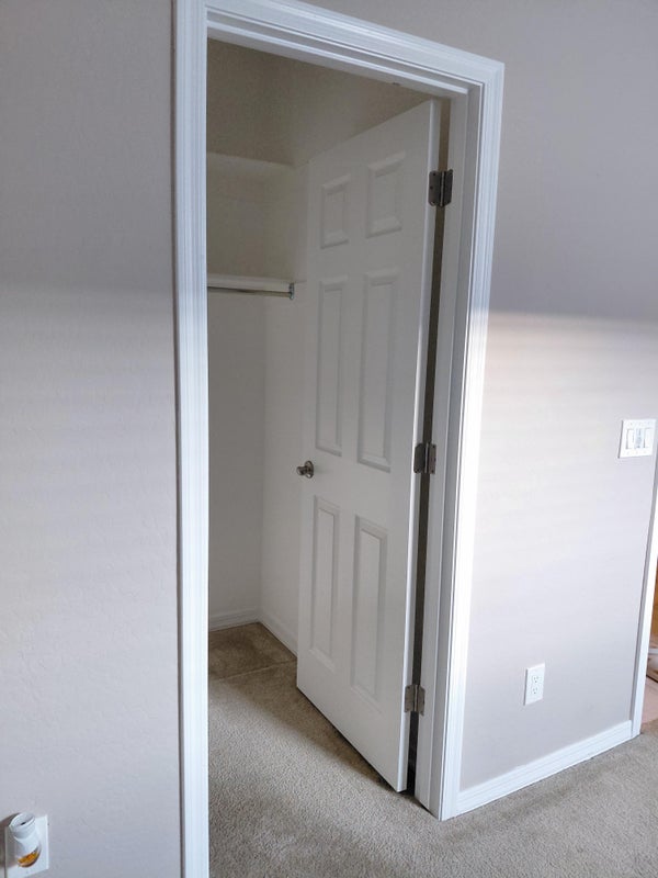 Private bedroom available in an owner-occupied single-story home in Phoenix. The room has clean carpet flooring, a square walk-in closet for storage, a ceiling fan, and a wall-mounted TV bracket already installed. The bathroom is a full bath shared with only one other tenant.