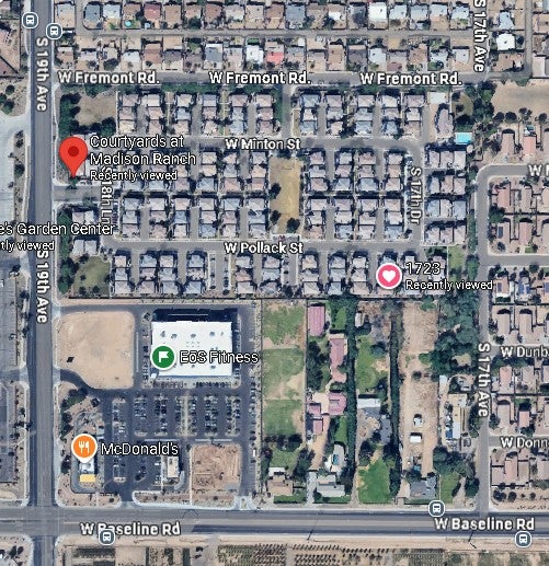 I have a group of college students vacating an Owner Occupied house at the Courtyards at Madison Ranch Community. It's at the NEC of 19th Ave & baseline Road, 85041" ((33.380491, -112.096783) on March 30th. After a Cleanout, it'll be move-in ready on April 4th. It's an 1800 sqft, 4B/3.5Ba - Ground Level is tiled. 2nd Fl is Carpeted. ALL Rooms are UNFURNISHED - Who wants to sleep on someone else's sticky mattress? -YUCK. Go buy an air mattress at Walmart 🙂 - 😮$1500/mo, MBR (14’ x 18’) with Private Bath & Closet - 🤔$1000/mo, Average+ (12’x’10’), Shared Hallway Bathroom - 🤔$ 800/mo, Average (10’x10’) Shared Hallway Bathroom - 🙂SINGLE Occupancy ONLY .. NO Couples, NO Kids & NO Pets 🙂NO Smoking. NO Vapor. NO Drugs - Illegal / Recreational 😮PLEASE don’t bring the Party, -or the Police Home with you 😄Full Access to Kitchen, Living Room, Loft & Laundry Room - Meet and Greet available today,... TXT: mark>.. any day between 3pm to 6pm. Touring will start after April 4th after 2pm until 6pm.