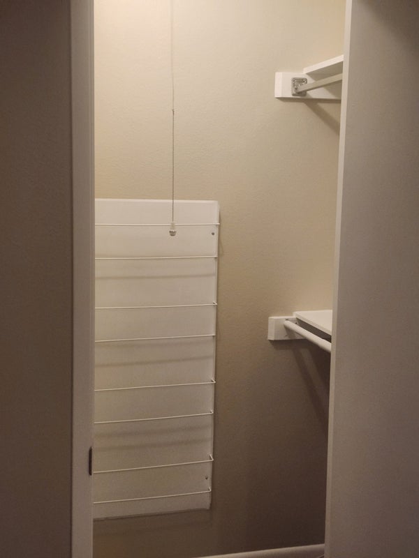 The room is unfurnished. Outside under the porch there are two industrial shelf-racks that are available if you need extra storage space.