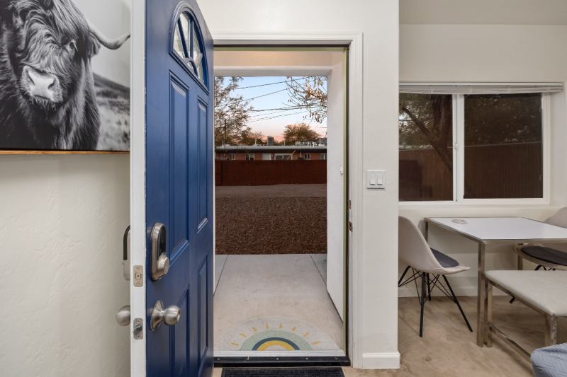 Comfortable and cozy space that can sleep up to people. The bedroom has a new queensized bed, dresser, and nightstands. Open living roomdining area with a TV, pullout couch to accommodate people. Modified kitchen with mini fridge, builtin ceramic cooktop, microwave, toaster oven, crockpot, and equipped with pots, pans, and cooking utensils. Stackable inunit washer & dryer. Spacious private fencedin yard, with plenty of parking. Standard background check required for all applicants.