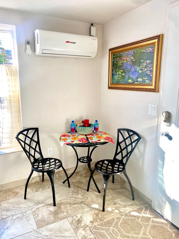 The space features a bright living area with natural light, comfortable seating, and a TV. The kitchen includes a dedicated dining area and is fully equipped with an induction cooktop, air fryer with oven, microwave, and all essential cookware perfect for easy everyday meals.The bedroom is set up for comfort with a cozy bed and storage, and the bathroom offers a clean, updated feel.