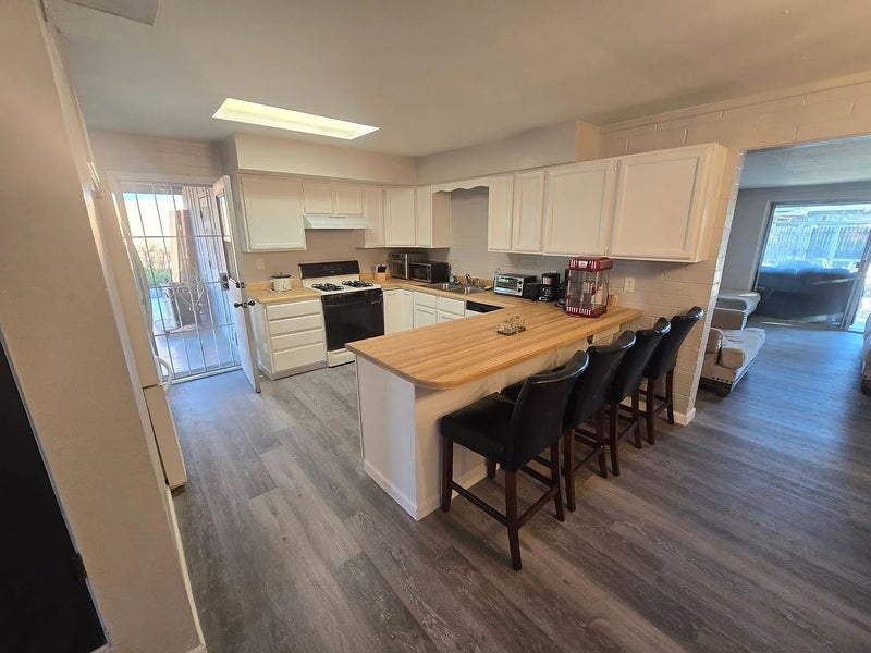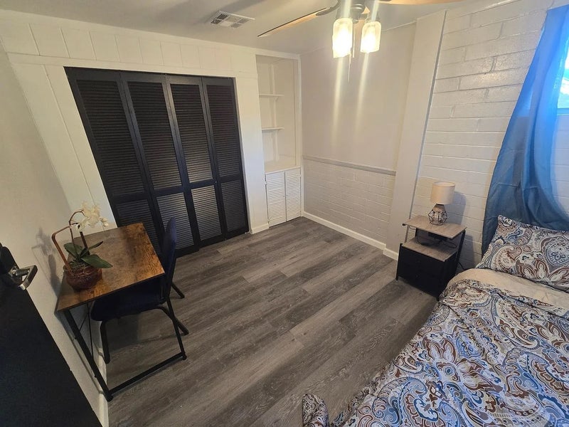 Room #with Bed with desk, lamp, side table, closet in a bed room Shared bathroom house, common area, Furnished Kitchen, Each bedroom has its own Key pad lock Laundry. wifi, utilities included.