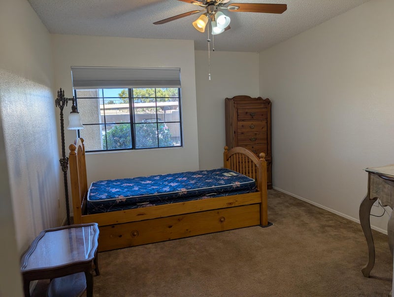 $745 / 2br - Furnished private room and bath available (TUCSON) North 1st avenue, at River Road TUCSON, AZ 85718 Furnished private room and bath available 2BR / 2Ba rent period: monthly private room cats are OK - purrr condo private bath w/d in unit furnished off-street parking no smoking air conditioning This is a large 1240 square foot two-bedroom, two full bath condominium to share, with a heated swimming pool, hot tub, sauna and locker room/showers, bike storage and a large gym. Located at River Road and North 1st Avenue on the Loop Riverwalk for biking, walking and jogging without worrying about cars. Your furnished downstairs bedroom has a lighted walk-in closet, walk-in shower in your separate full bath. The room is furnished with a bed, dresser, table and desk. There is a washing machine and clothes dryer in the unit. Ceiling fans and overhead lighting, as well as wall lighting in every room. There's a fireplace, and a loft with a large balcony. The kitchen includes a dishwasher, microwave, and toaster oven. There is central air conditioning and heat. The unit features high ceilings, and a fireplace. There is a lot of shelving available. Non-smoker, neat and clean professional wanted to share the condo with one other. We would split the electric bill in half. Water and trash included. No drugs. Social drinking is fine. There is parking very close, but it is not covered. This is 15 minutes to University of Arizona. There is a non-refundable $40 application fee with background check and one month rent for refundable deposit required. Cats are okay with an additional fee. Rent is $745 a month, plus half of the electric bill. References and proof of income required. This is available April 6, possibly sooner. Short-term is okay. Please feel free to call with any questions and tell me about yourself. You would be living with a non-smoker female, who likes biking and reading and hiking, being outside, going to the gym, eating out, Cooks rarely. I like animals but have no pets at this time.