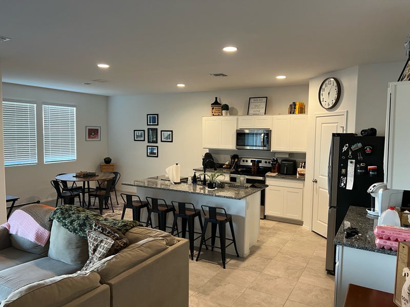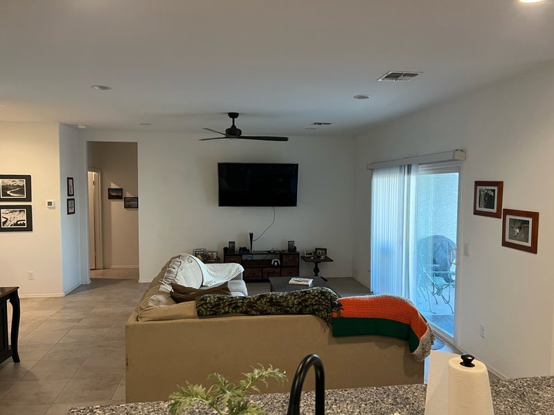 Smoking is outside or in the garage! Beautiful four bedroom, 2 bath home ready for room rental. This home is located on a large oversize lot in a very nice newer neighborhood with greenbelt areas and walking paths. When entering the home you will notice the beautiful tile located throughout all of the main areas...hallways, bathrooms, living room and kitchen. This home features an open floor plan with the living room, kitchen and dining area. The kitchen has all newer stainless steel appliances, granite countertops, abundant cabinet and counter space. Also included is a walk in pantry. There are two carpeted rooms for rent that are located at the front of this split floor plan home. The bathroom is located by these rooms and features a dual sink and separate toilet shower area. All bedrooms are equipped with remote control ceiling fans and closets. Home will be furnished, not the rooms. Built-in custom cabinets are located in the garage for possible storage, as well as two work stations.
