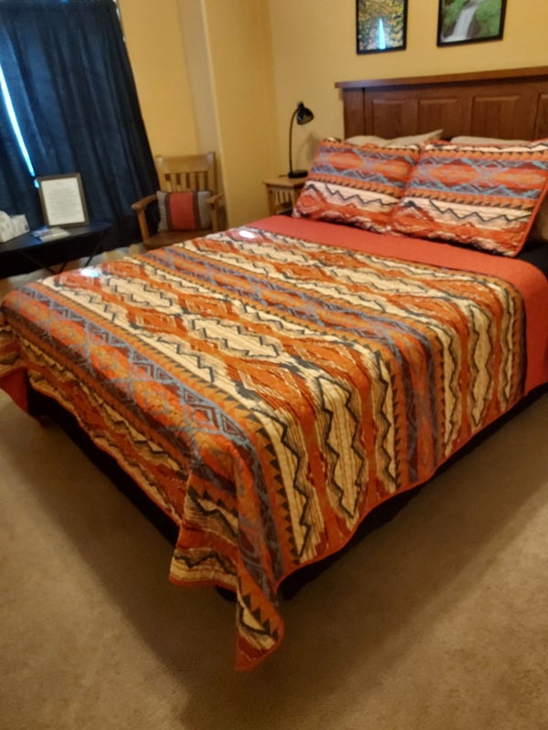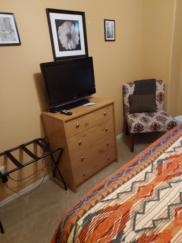 The room is located opposite [f the main living area in the house. There are blackout curtains for those who work a late shift. The room is furnished with a queen bed, a potable small table that doubles as a work station. There is a television with the Amazon firestick. The bathroom is shared, if there is another renter, which is rare. There is access to the kitchen, laundry and back patio. The landlord does live on the property and is located on opposite side of the house, with three dogs(who are spoilt). There is no smoking or drunkiness on property. The house centrally located to stores, restaurant s and major highways, between Pheonix and Tucson.