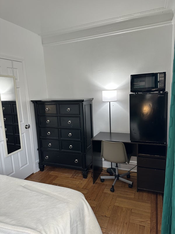 Female preferred. Queen size bed, nightstand, tall dresser, desk with chair, and mirror. Mini fridge and microwave inside room. Private key for bedroom. Outside closet available. Big windows with lots of sunlight. Near major public transportation trains and buses.