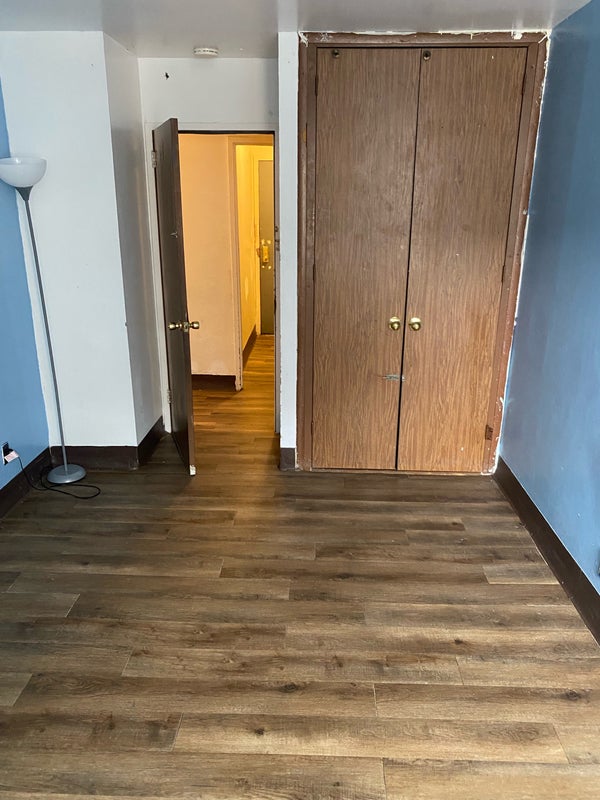 Nice room for rent Painted blue safe space accessible to the bathroom and kitchen utilities included air conditioner inside cleaning supplies included also .