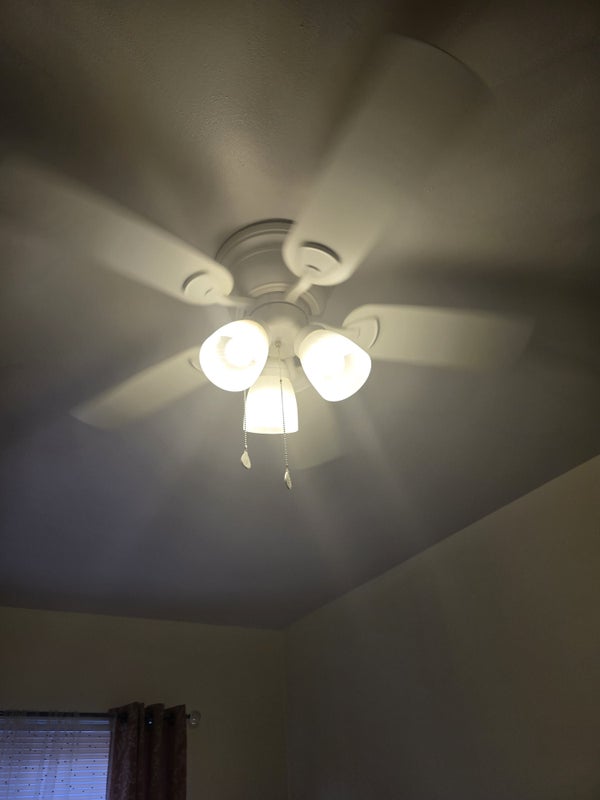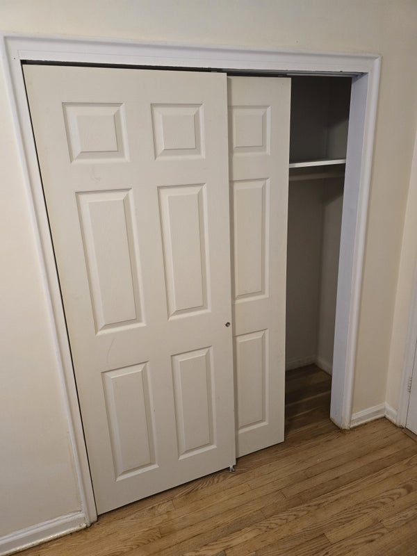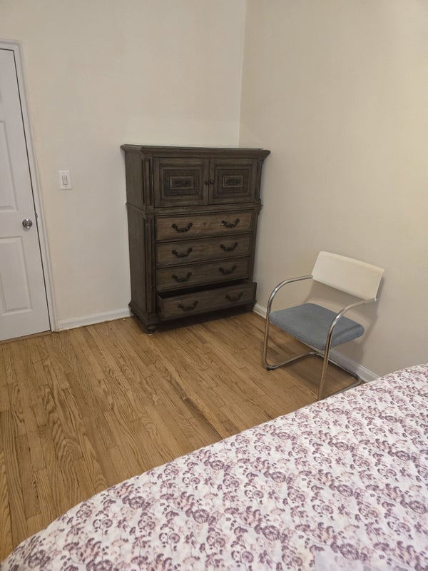 Bedroom comes with a bed, dresser and one side table with a lamp and a sliding closet with a ceiling fan