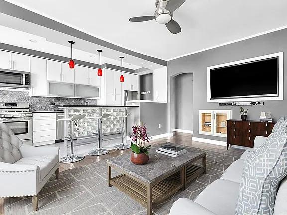 As you enter, you're greeted by a spacious layout filled with natural light. The windowed kitchen is both functional and stylish, featuring granite countertops, a tile backsplash, and stainless steel appliances, making it ideal for everyday cooking and entertaining. The generously sized living room provides ample space for relaxing or hosting, while large windows enhance the airy feel of the home.