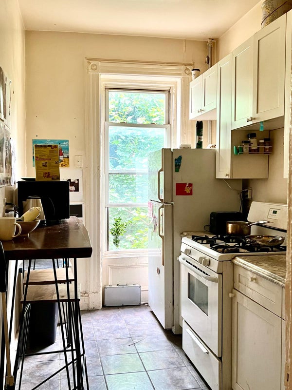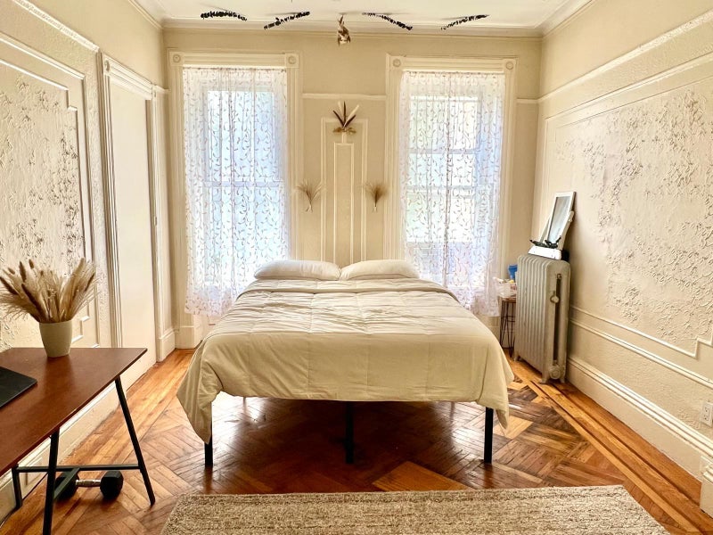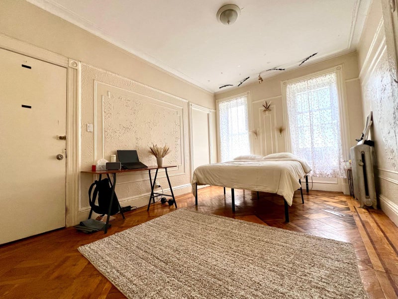 The room available is on the top level of this three-story, nine bedroom brownstone. It is a very large room, with natural light coming in through two big windows. It can be rented either furnished or unfurnished, whichever is preferred. The bathroom is shared with two other roommates, and the kitchen is shared between the three of you.