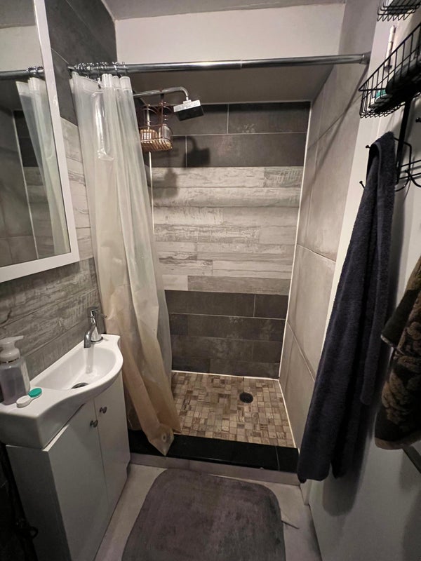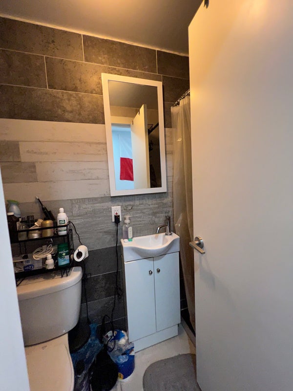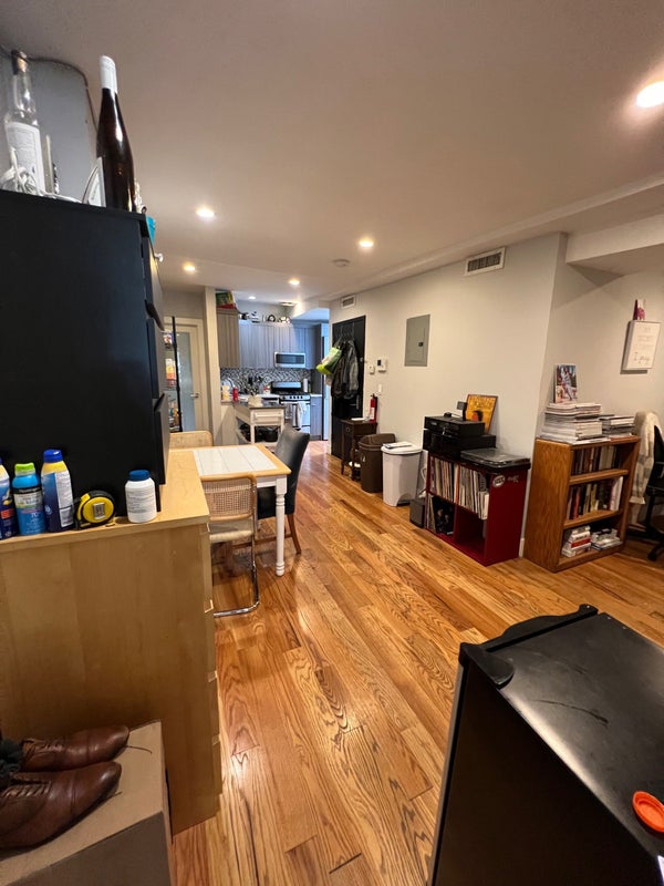 The apartment is a 4th floor walk-up in a 4-apartment converted brownstone. It was recently renovated within the last 5 years, with hardwood floors, new appliances, and modern grey/white finishing. Management installed a separate bathroom within each of the 4 rooms, that is your own to use. The layout has an open common area/kitchen that we mostly use to cook and eat in. Most of the common stuff belongs to the tenant moving out and he is willing to negotiate leaving some of it. The front of the building has a keypad entry, with a video/mic feed to the unit.