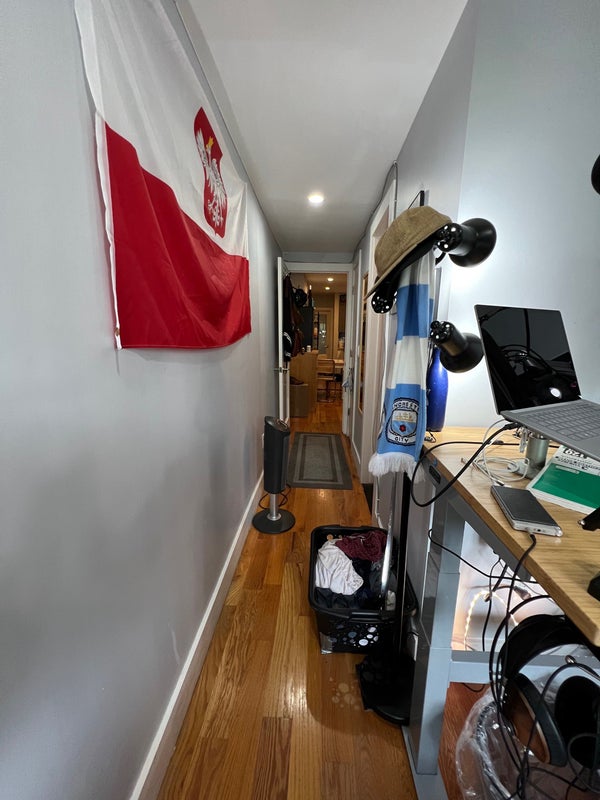 The Room: The largest in the apartment due to having a smaller bathroom, the room is best described as cozy if you have a queen size bed and a 6’ desk. With a smaller bed, you would have more space for dressers / etc. You have access to a side building fire escape, although there isn’t a lot of space to stand / sit. The room tends to run cold compared to the other side of the apartment. The current tenant can be negotiated with to leave the shelves, curtains, clothes hangers, and various bathroom storage.