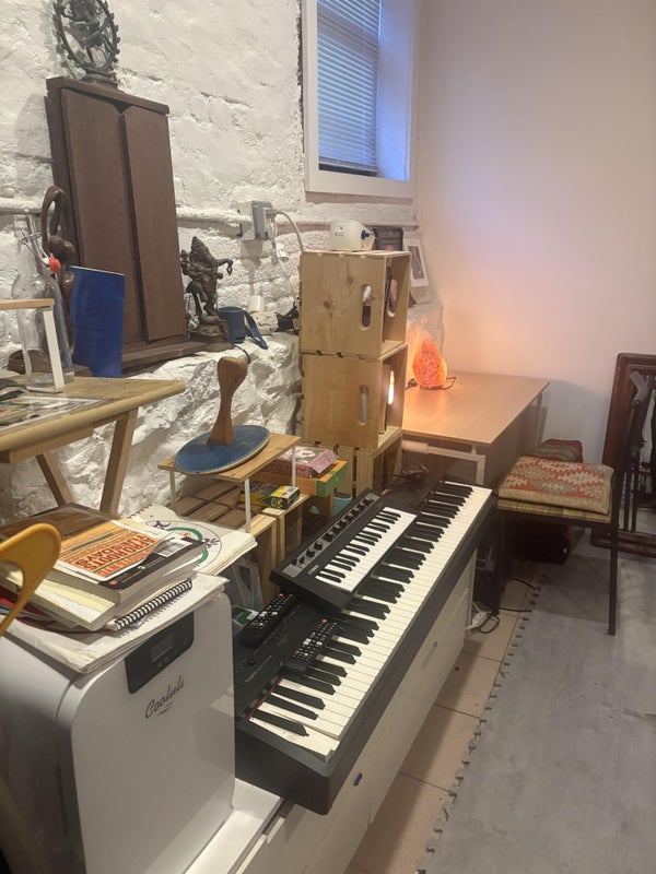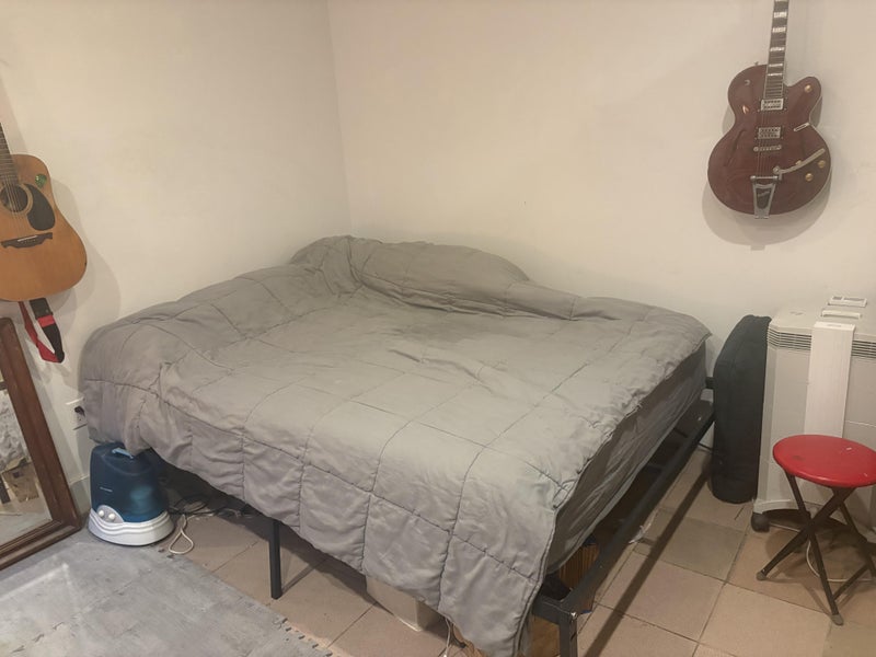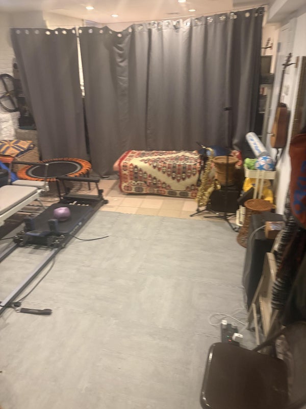 The bedroom has 11 foot high ceilings a large window. We are all easy going people who respect each other's privacy. I'm a massage therapist, there. is also a dog walker and dance instructor living here. The room is a very large room basically it’s the downstairs of a two-story apartment. There’s a half bath there as well as a complete workout area, which has Pilates reformer equipment, a trampoline massage table all sorts of great tools for self healing on the other side of the Workout area there is a queen size bed, which is very comfortable. There is also a portable hanging closet for clothes and a good size dresser. i’m a guitar player so there’s a bunch of guitars laying around and also keyboard in case you aren’t musically inclined. I don’t mind you playing my instruments. There’s a Japanese woman named yoko who occasionally will use the Workout area and bathroom otherwise it’s very private and very quiet
