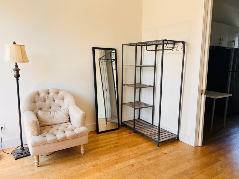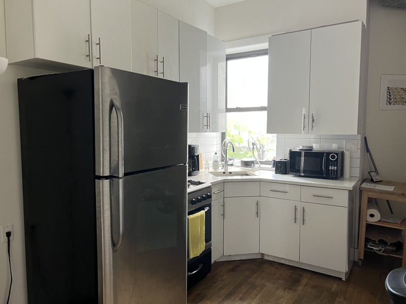 The building has washer and dryers in the basement, and the unit has central AC and heating. As far as the neighborhood goes, there’s a 24 hour bodega just downstairs. We are a 7 minute walk from the C Train, 10 minutes from the J and about 20 minutes from the L.