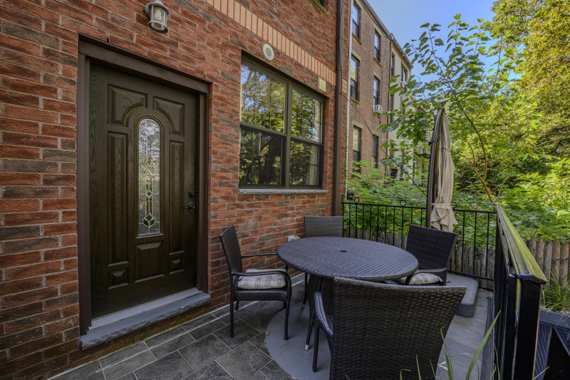 Step outside to your own private backyard oasis—accessible from both the kitchen and the lower level. The space features a dining deck with seating and a retractable umbrella, a landscaped patio framed by 2-foot planters, and a covered storage area beneath the deck perfect for bikes or outdoor equipment.