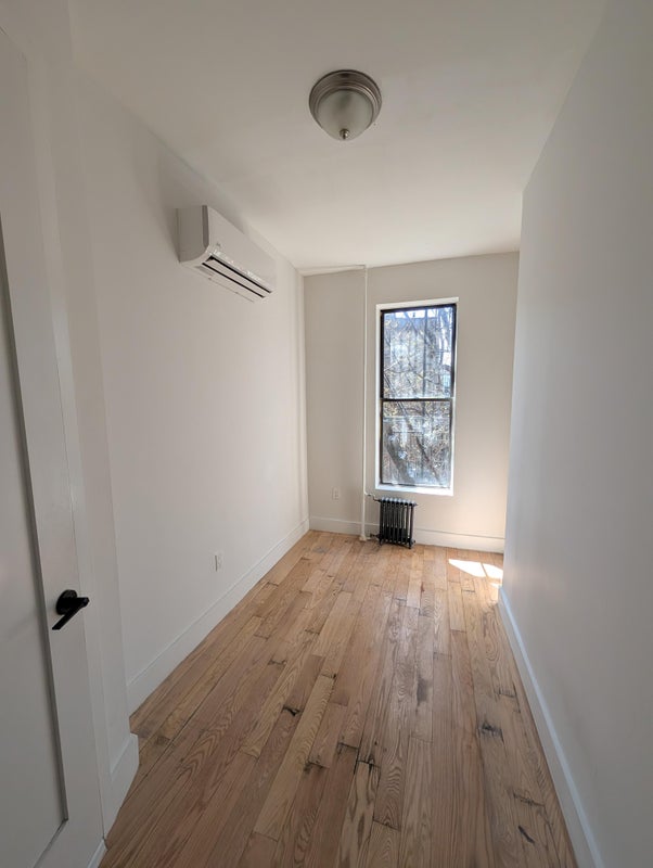 Backyard facing bedroom gets lots of sunlight. Very large floor-to-ceiling closet, a fire escape. High ceilings (11ft). Wood floors. Can fit a queen bed and desk.