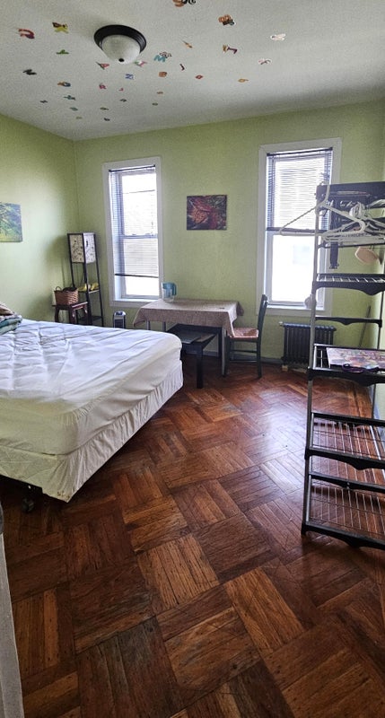The room has furniture: bed, desk, chair, clothes rack, nightstand. It has 2 windows. No living room, but a larger kitchen, you are welcome to use it as long as you clean up after yourself.