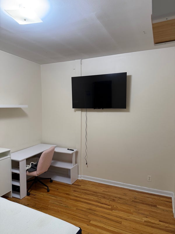 The Room: • Full-sized bed with storage underneath. Desk • 1 closet • AC unit and TV already set up.