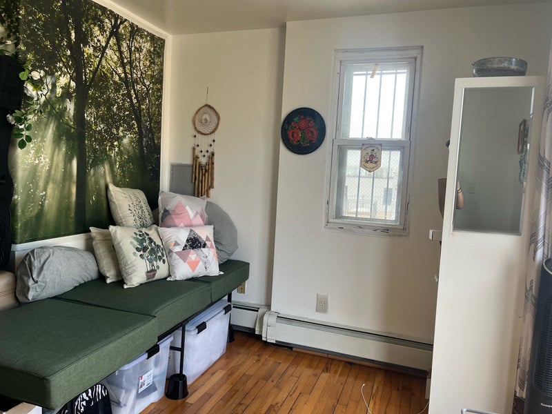Furniture: -Twin bed frame, mattress, IKEA shelf unit, ELFA shelf closet, small AC