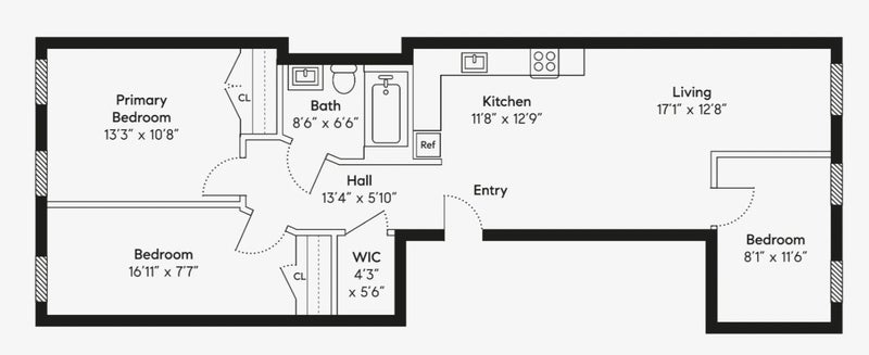 - $2000 Bedroom 1 is 13'3 x 10'8 with a large closet and two windows - $1900 Bedroom 2 is 16'11 x 7'7 with a large closet and one window - $1600 Bedroom 3 is 8'1 x 11'6 with two windows
