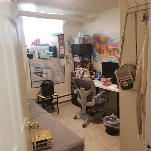 No kitchen access, but a microwave provided. The last roommate had a mini-fridge, plus there are grocery stores with buffets nearby. Shared bathroom. There's a cat in the apartment, but we can't really have another pet.