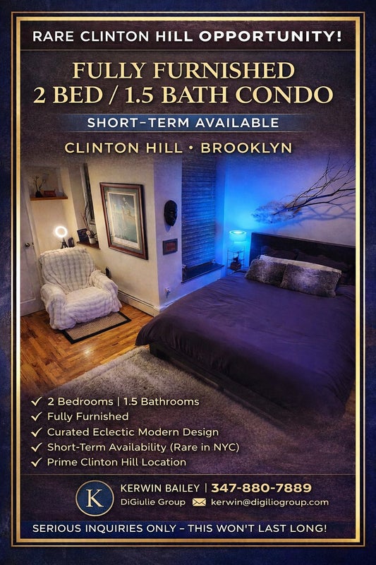 Spacious 2-bedroom condo in the heart of Clinton Hill, fully furnished and move-in ready. Perfect for two roommates renting together or as a full apartment. One bedroom is larger — great for flexible living arrangements. Short- and long-term rentals considered. Easy application — contact the broker today to schedule a tour!