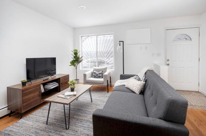 - With hardwood flooring, there is a spacious living room with a couch, and TV for relaxing.