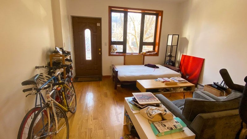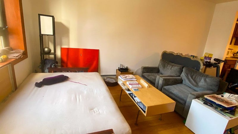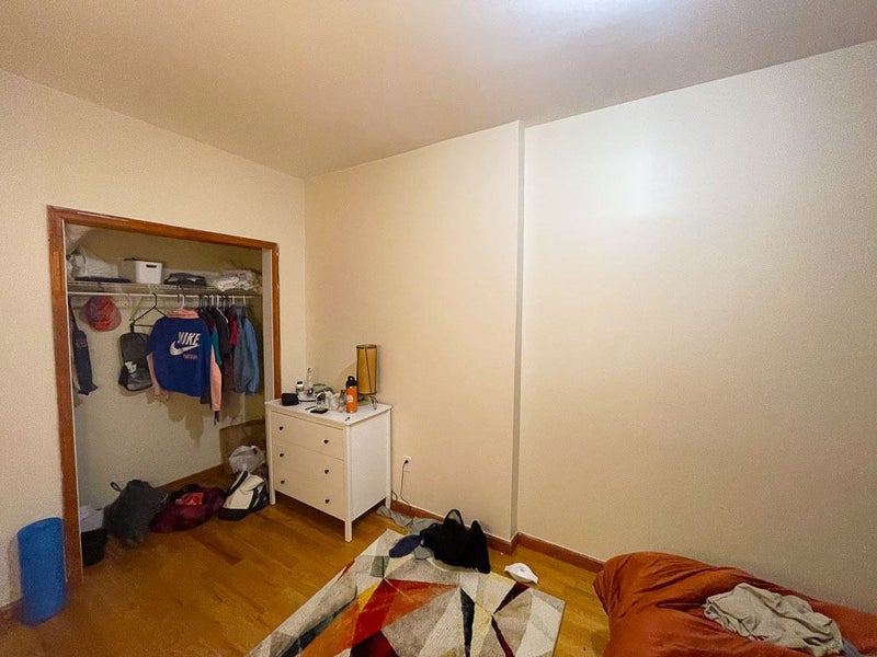 THE ROOM: Comes furnished with a lightly used full-sized bed featuring an eco-friendly Keetsa mattress, Buffy comforter/duvet cover, mattress protector, and Crate & Barrel pillows and sheets on an IKEA frame. There's also an IKEA dresser, unassembled bookcase, AC unit, rug, lamp and large closet with plenty of hangers. The room is not available unfurnished but there is some room for additional furniture such as a desk/chair/side table since it's quite large (about 12 x 13 feet). The room is located in the back of the apartment and faces out to a serene scene of trees, birds, and shrubbery.