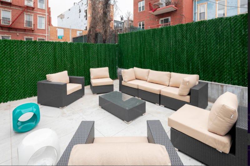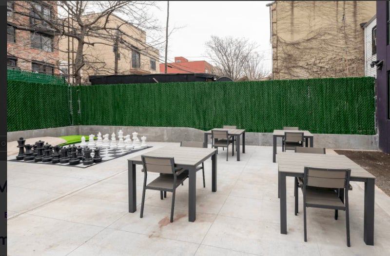 - The building has a shared backyard with lounge chairs, couches, and tables.
