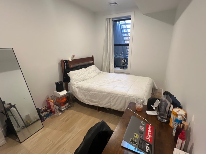 medium sized bedroom that can comfortably fit a full size bed and a desk - Also comes with a built in closet. You would be sharing a bathroom with one other roommate. We have a fairly sizeable kitchen / living room with a dishwasher as well as a washing machine and drier. About a 12 min walk from the L train and 6 min walk from the J. Most utilities are taken care of my me but we will be splitting wifi and kitchen stuff for no more than about 50 dollars each month.