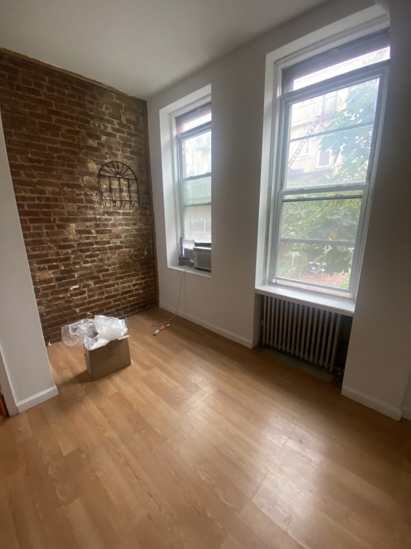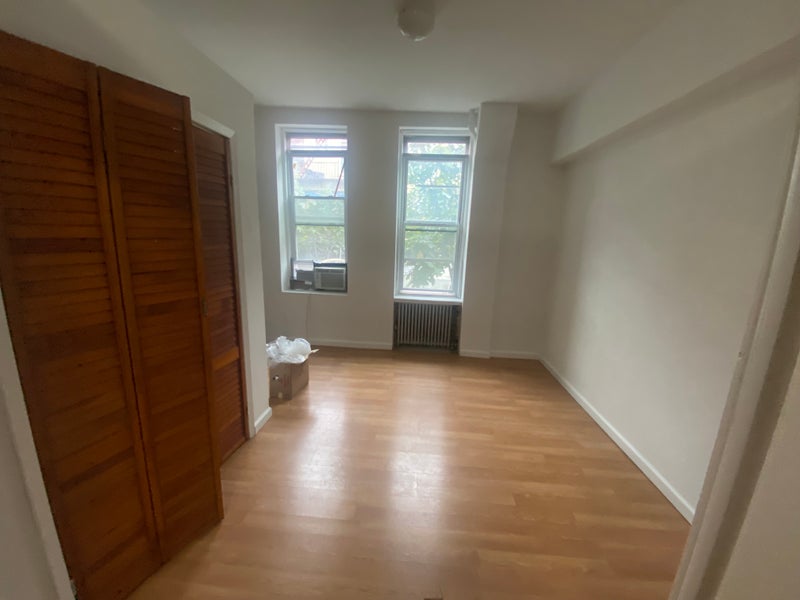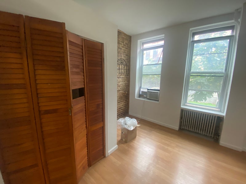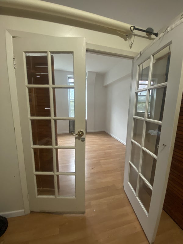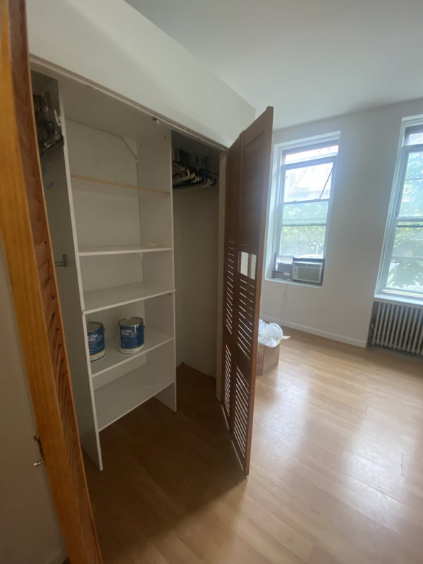 Freshly painted and cleaned up room in a large first floor unit. This room faces the rear of the building and gets plenty of sunlight through two large windows. You'll be fixed up with a huge closet, complete with shelving, as well as overhead storage (which we also have more of in the hallway). Room has french doors, but these can be easily covered with drapes for your privacy.