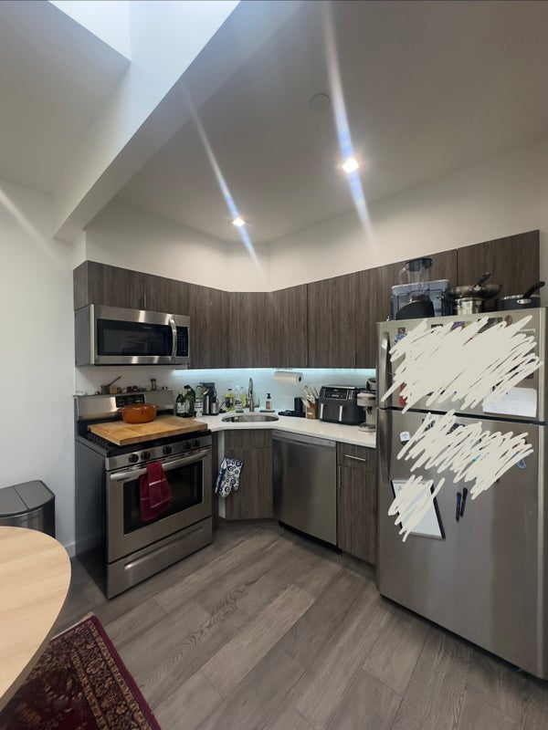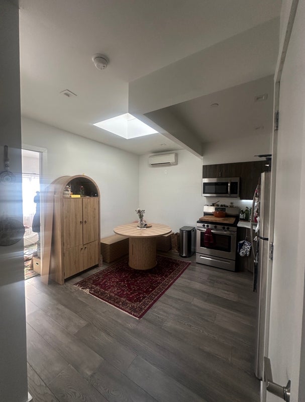 About the unit: 4th floor walk up with lovely skylight and roof access. Full kitchen with gas range and dishwasher. Washer and dryer in unit and a bathtub as well. Bedrooms/ common space have individual wall units for AC/heat. The common space is modest but super cozy and functional.